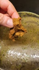 Bring the broth to a gentle simmer — not a rolling boil. Then start tearing off small pieces of dough and dropping them in one by one. Stir occasionally to keep things from sticking to the bottom. Once all your dough is swimming, let it cook.