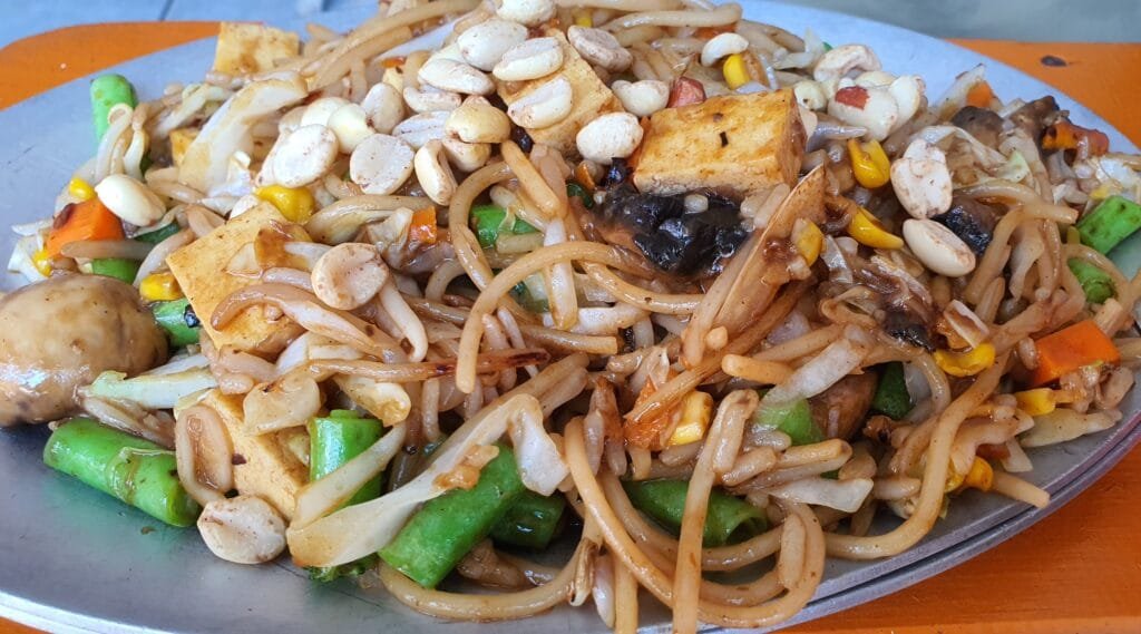 The cooking happens right out front, where twin woks blaze on the sidewalk, sending up aromatic clouds of Thai basil, soy, and sizzling garlic. It’s street food with flair, and the open-air setup invites passersby to stop, watch, and indulge.
